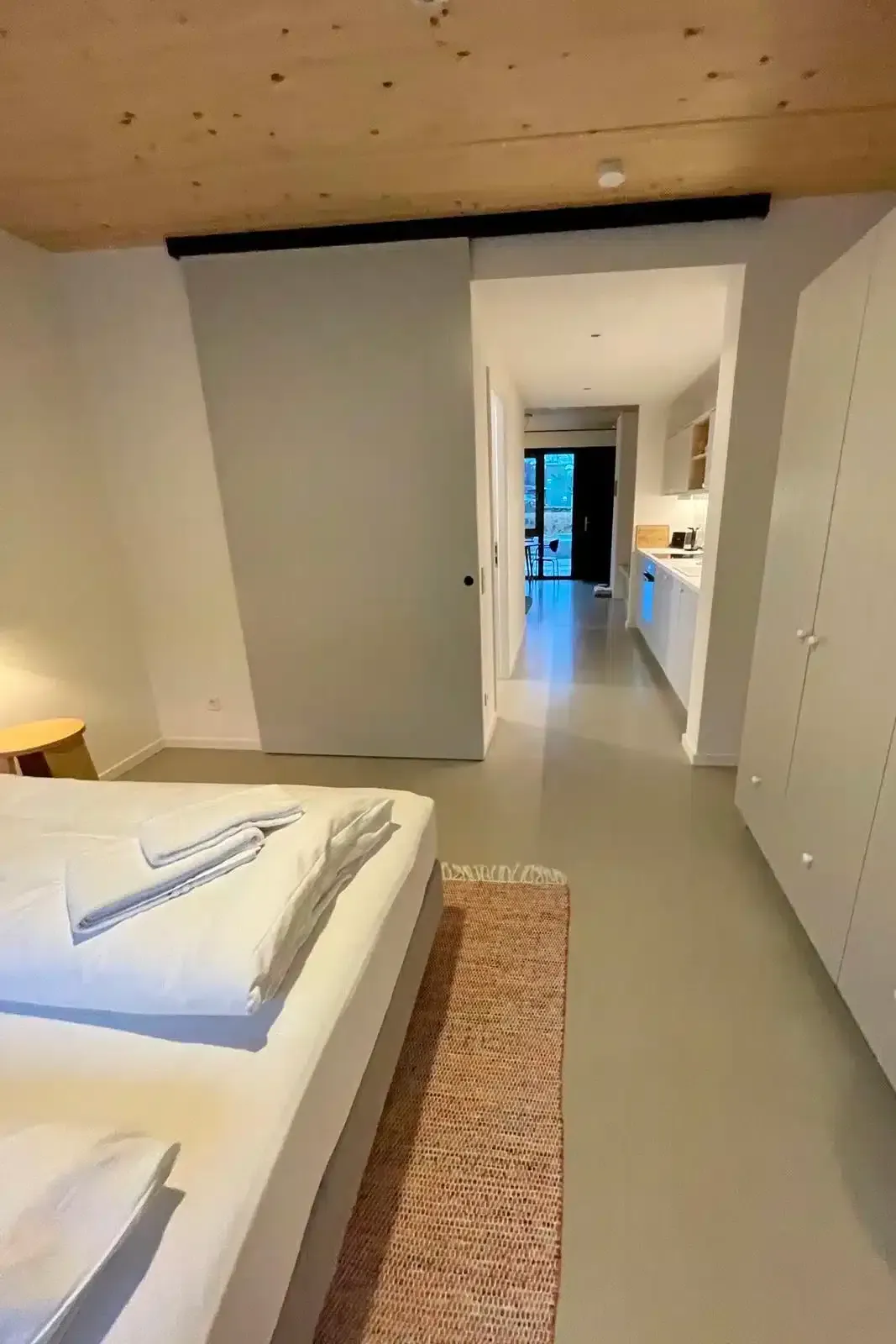Das Schlafzimmer ist durch eine Schiebetür abtrennbar, so kann man sich jederzeit eine kleine Auszeit 🛌 nehmen. Das Boxspring Bett in der Größe 180x200 cm sorgt für erholsamen Schlaf. Außerdem gibt es wunderschöne, praktische Verdunklungsvorhänge. Neben dem Bett ist noch ausreichend Platz für ein Kinderbett, das kostenlos zugebucht werden kann.