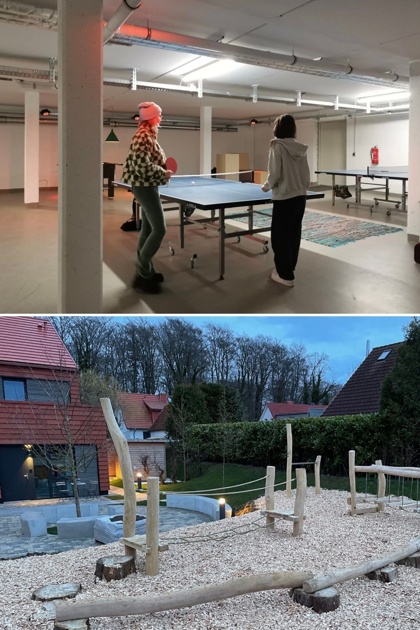 Ein weiterer Geheimtipp ist der Spielkeller. Hier stehen zwei Tischtennisplatten, eine dicke Turnmatte, ein gemütliches Sofa,ein Maltisch und ein Tischkicker zur Verfügung. Auch eine Skaterrampe wurde neu angeschafft. Damit sich auch die Größeren wohlfühlen, stehen große Bluetooth-Boxen und Farblicht bereit. Hier können sich Groß und Klein nach Herzenslust auspowern.