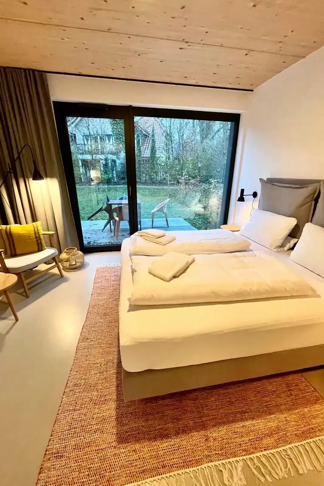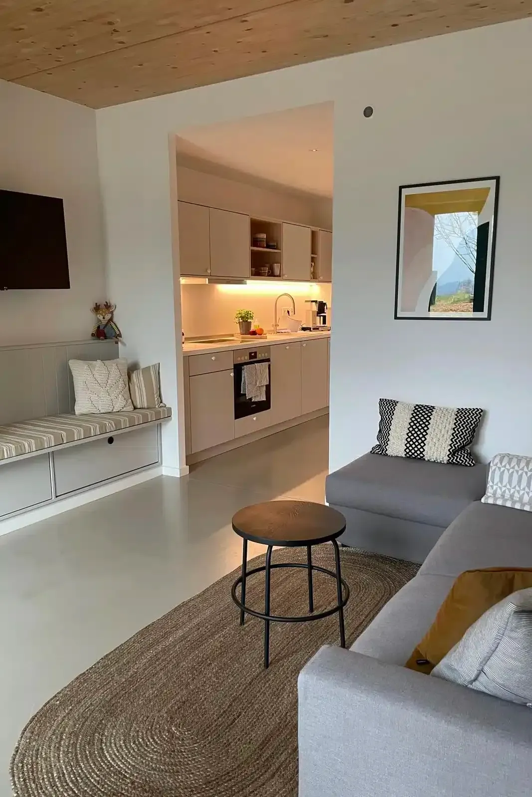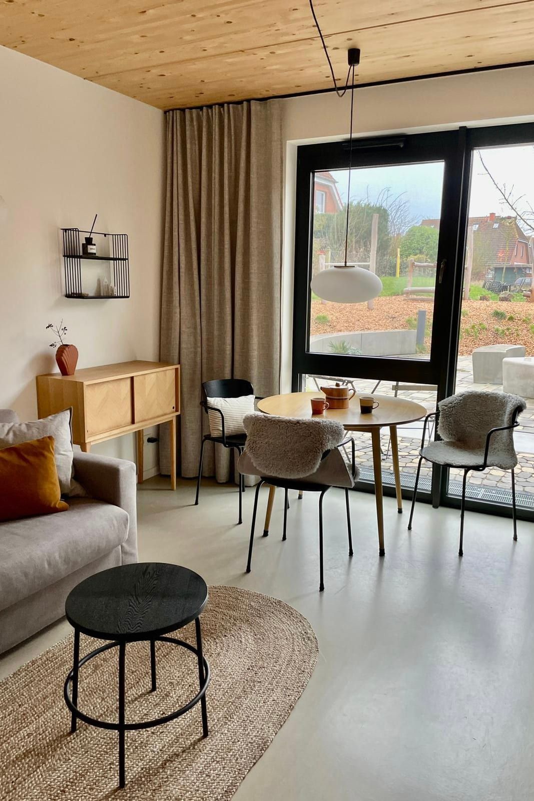 Wir starten mit dem Wohn-/ Esszimmer. Das nordische Design mit viel Liebe zum Detail lädt zum Entspannen und Wohlfühlen ein. Das hochwertige Boxspringsofa lässt sich mit einem Handgriff in ein wirklich sehr bequemes Schlafsofa für 2 Personen verwandeln. Der runde Esstisch, sowie die nordische Holzbank mit ihren Sitzpolstern bieten Sitzgelegenheiten für jeden Geschmack. Bei einer heissen Tasse Tee🫖 könnt ihr den wundervollen Blick durch die bodentiefen Fenster genießen. Unser großes Smart TV rundet den Wohnbereich ab. Die Fußbodenheizung sorgt in Kombination mit der Naturholzdecke für ein tolles Wohlfühlklima. Auch Arbeiten ⌨️ ist durch das leistungsfähige und stabile WLAN uneingeschränkt möglich.