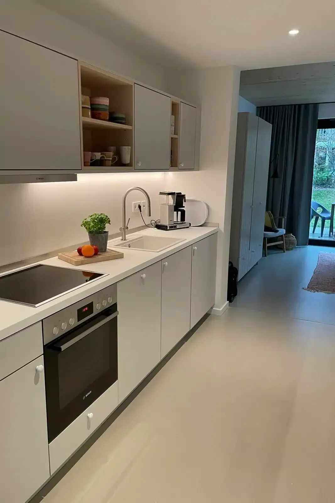 heute möchten wir Euch unsere hübsche Küche im freundlich hellen Lichtgrau zeigen. Sie verfügt über Qualitäts-Elektrogeräte von deutschen Markenherstellern (Ceran Kochfeld, Backofen, Spülmaschine und Kühl-/Gefrierkombination, Dunstabzugshaube, Wasserkocher, Pürierstab und Toaster).