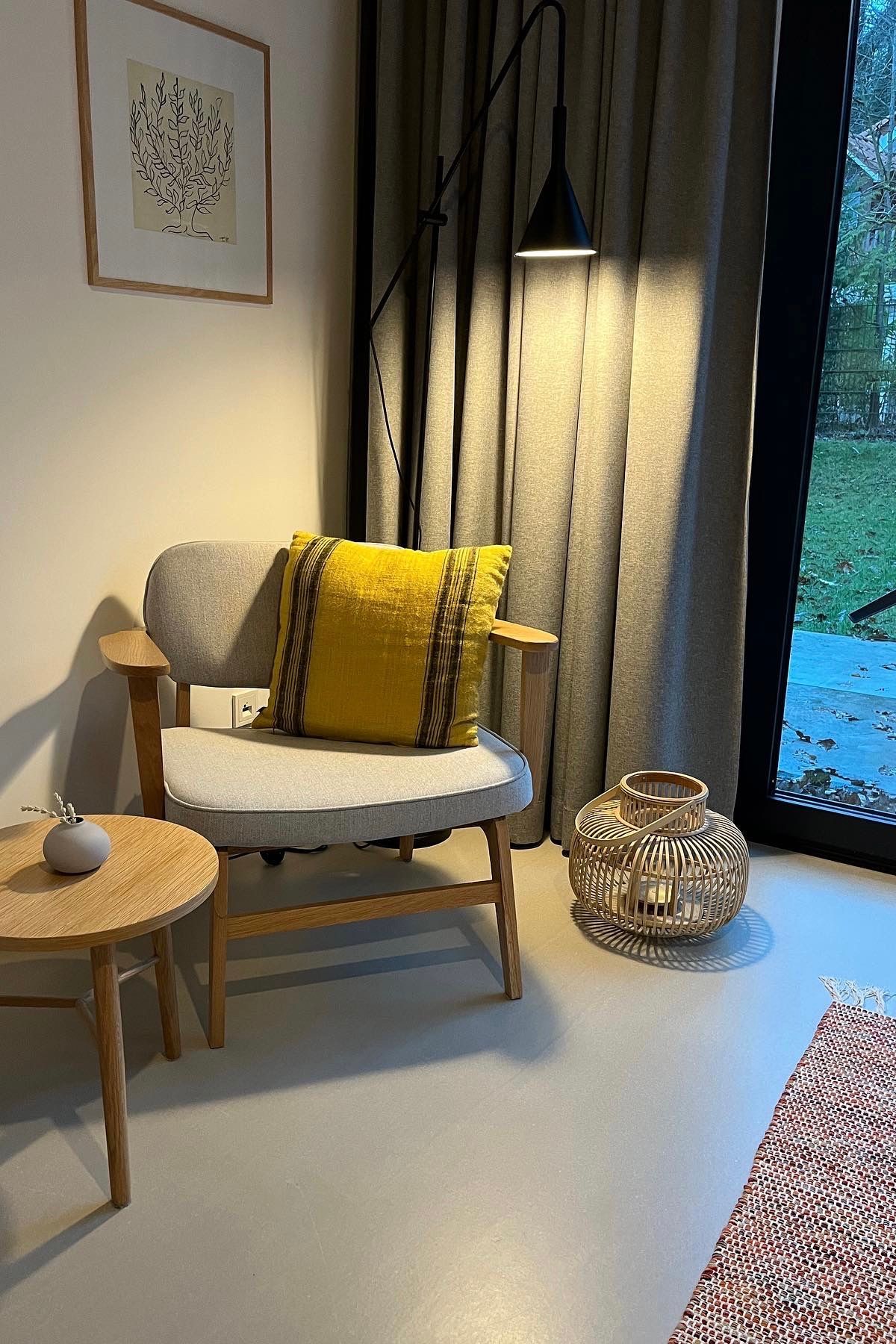 Ein hochwertiger Sessel mit Leselampe und Beistelltisch sowie die bodentiefen Fenster mit Blick in den Garten runden den Raum ab.